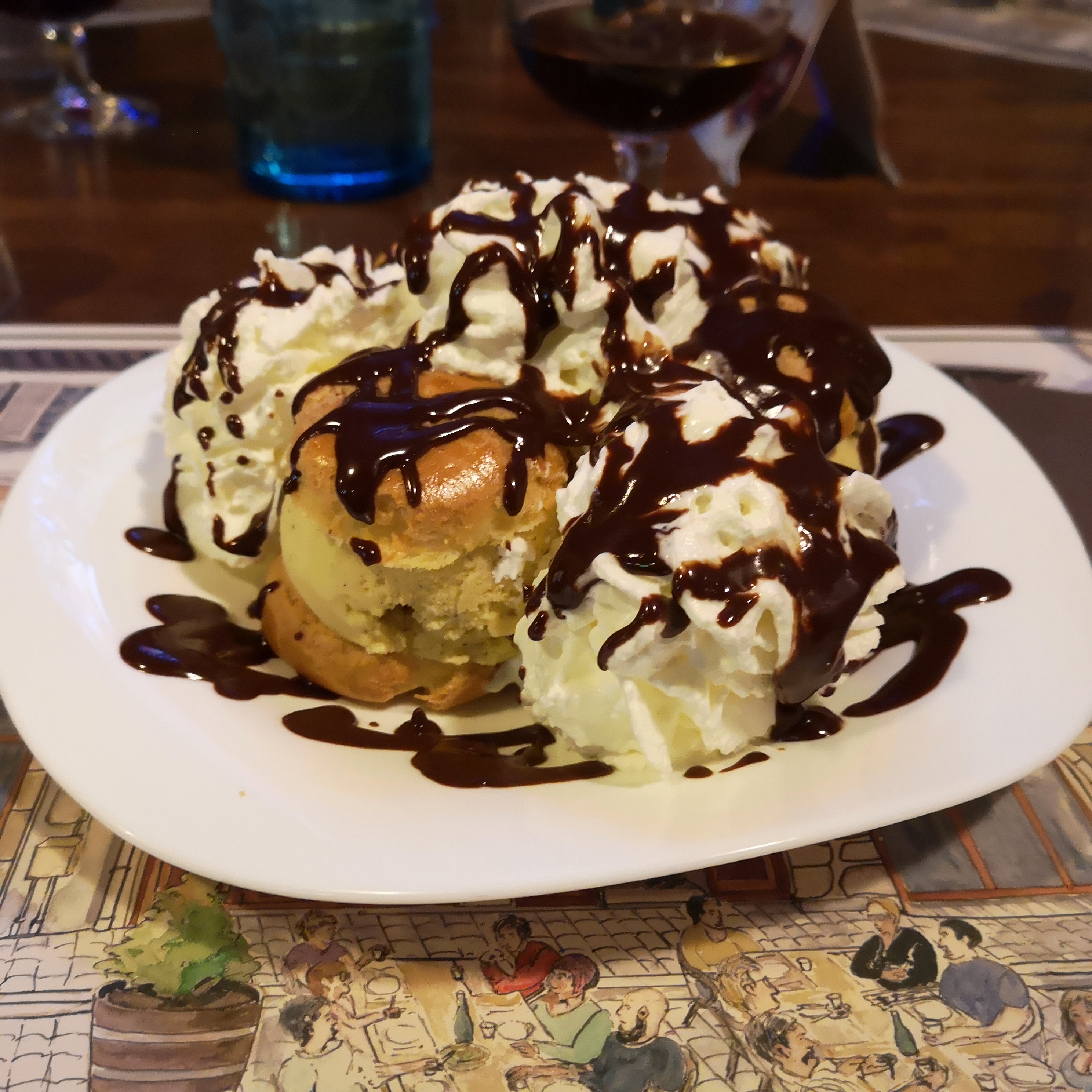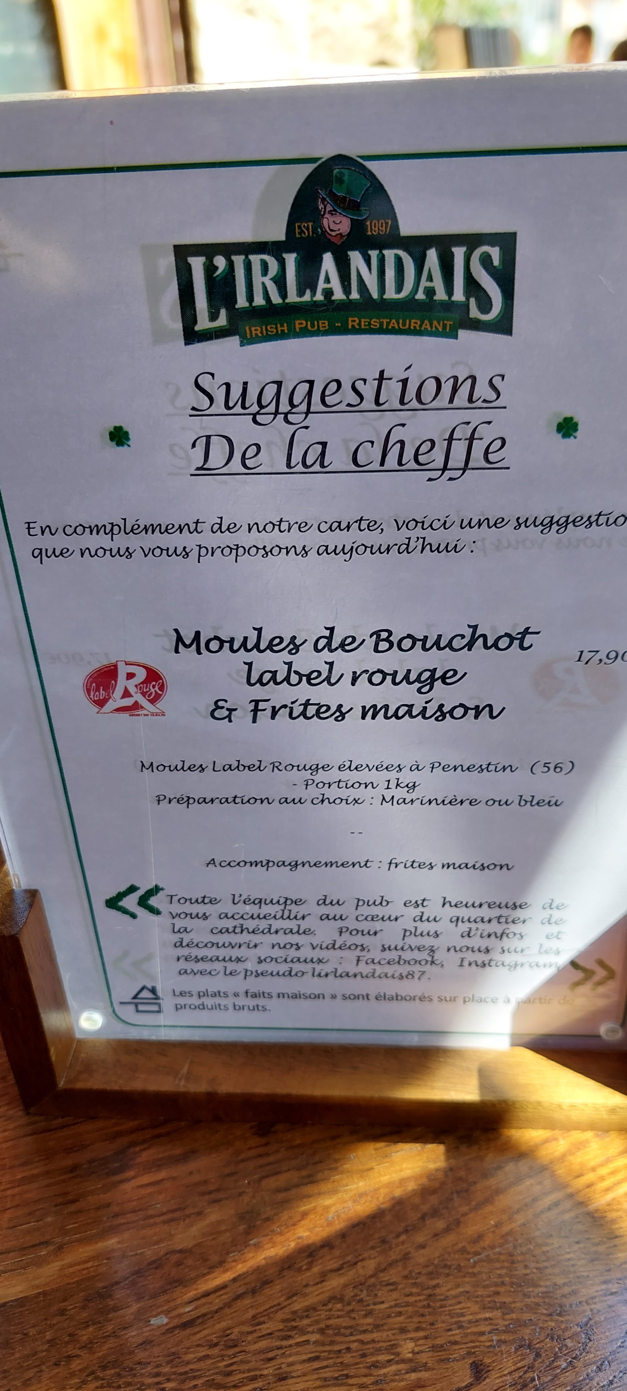 Posté le 15/09/2023 à 16:06"Je teste ce restaurant au détour de la vieille ville. La décoration est style pub irlandais. J'apprécie le Burger Maison à 15,90 €. Steak cuit comme demandé. Ingrédients de bonne qualité. Un bémol est le mini pot de frites, la mini portion de crudités, le pain mou et détrempé du burger. J'adore les profiteroles à 7,90 €. Choux croustillants, chantilly maison. Je me suis régalé. Malgré un prix total élevé pour un plat et un dessert, j'ai pris du plaisir à la table de ce restaurant. Quelques ajustements pour viser les 5 étoiles 😉"