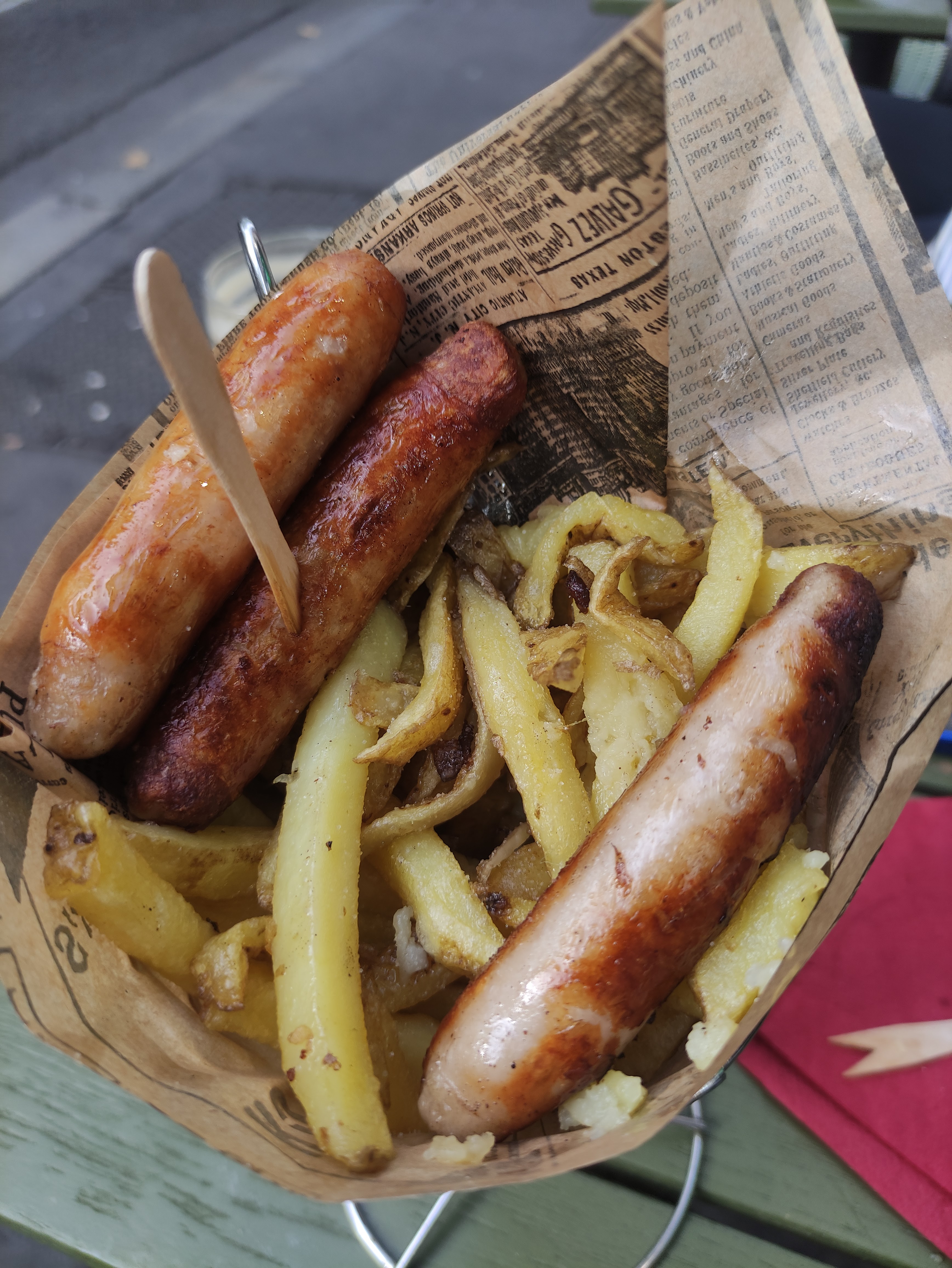 Venu à 3 à 14h30 un dimanche. Nous demandons si la cuisine est encore ouverte. Oui mais seulement pour une frites saucisses. Bonne idée avec une Guinness. Et puis le plat arrive. Les saucisses, bonnes. Mais des frites ignobles. Grasses, pas cuites. On sent encore la patate pas cuite, dégoulinantes d'huile de friture. Tellement gras que l'huile coulé sous le cornet. On en rigole. Non vraiment ce n'est pas raisonnable de servir cela.